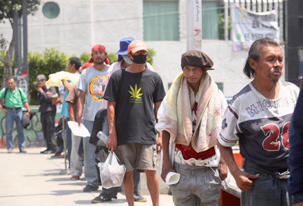 ▲ La jefa de Gobierno informó que analiza llevar a otras zonas de la Ciudad de México las medidas epidemiológicas aplicadas en ese centro de distribución, como parte del paso a la nueva normalidad, para evitar rebrotes. Aseguró que no hay sobrecupo de pacientes de Covid-19 en la capital y que llegaron 110 ventiladores más. Mientras, la Secretaría de Salud dio a conocer que subió a 62 mil 527 la cifra de contagios en el país y a 6 mil 989 la de muertos, con 479 decesos más respecto al jueves. En la imagen, fila en la glorieta de Insurgentes para recibir una ración de comida, como parte del apoyo a personas sin empleo o en situación de calle. Foto Yazmín Ortega / L. Poy y R. González