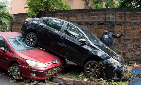 ▲ El presidente Nayib Bukele declaró el estado de emergencia en el país tras el paso de la tormenta, la cual dejó viviendas destruidas o inundadas, cortes de electricidad, desbordamiento de ríos y vehículos arrastrados (imagen en San Salvador, la capital). Amanda se degradó a depresión tropical al adentrarse en Guatemala, nación que también se mantiene en alerta por las precipitaciones. Foto Afp
