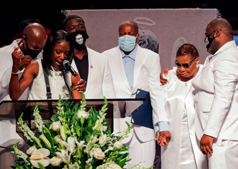 ▲ En la ceremonia fúnebre en Houston participaron familiares del afroestadunidense fallecido en un violento arresto policial, líderes de derechos civiles y deudos de otras víctimas de agresiones raciales en años recientes; la ceremonia fue transmitida en directo por televisión. La ola de protestas se mantuvo en las calles de varias ciudades, lo cual ha generado que figuras políticas promuevan reformas para prohibir en las corporaciones de vigilancia tácticas de forcejeos físicos en las detenciones. Foto Afp. / David Brooks, corresponsal