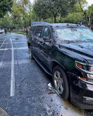 ▲ Con apoyo de la Guardia Nacional, la policía capitalina patrulla la Ciudad de México, informó la jefa de Gobierno, Claudia Sheinbaum, luego del atentado contra el secretario de Seguridad de la CDMX, Omar García Harfuch, quien recibió tres disparos. En el lugar aseguraron armas de diferentes calibres, un fusil Barrett, granadas, chalecos antibalas y varios vehículos. En la imagen, la camioneta donde viajaba el funcionario. Foto Cuartoscuro / Rocío González Alvarado
