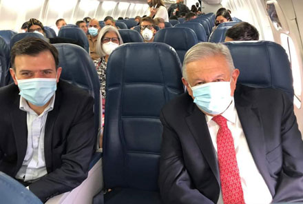 ▲ En el vuelo comercial que lo llevó a su visita de trabajo en Estados Unidos, el presidente Andrés Manuel López Obrador portó por primera vez un cubrebocas desde que comenzó la pandemia del coronavirus. Durante la conferencia mañanera, informó que salió negativo en la prueba del Covid-19. En su traslado hizo una escala en Atlanta y arribó a Washington alrededor de las 22 horas.