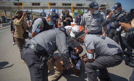 ▲ Integrantes de la Guardia Nacional detuvieron a tres manifestantes que intentaron recuperar la caseta de Playas de Tijuana-Rosarito la mañana del jueves, horas después de que la autoridad federal reactivó el cobro de peaje que el gobernador Jaime Bonilla había cancelado mediante un decreto. La acción de fuerzas armadas fue