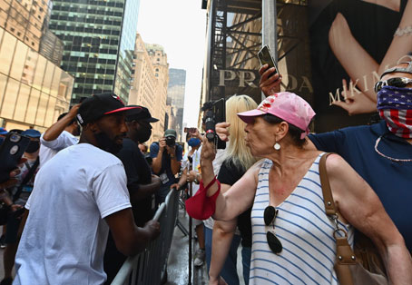 ▲ En la puesta de la leyenda, con enormes letras amarillas sobre la icónica Quinta Avenida de Nueva York, participó el alcalde Bill de Blasio. Decenas de activistas acudieron al acto en favor de la justicia racial tras la muerte del afroestadunidense George Floyd a manos de un policía de raza blanca en Minneapolis. El presidente estadunidense tuiteó la semana pasada que poner ese mensaje callejero sería