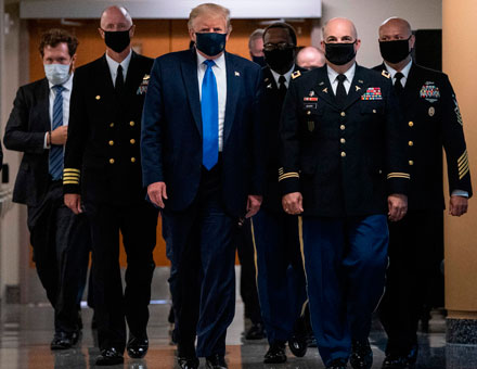 ▲ El mandatario cedió a la intensa presión para establecer un ejemplo de salud pública, durante su visita a veteranos heridos y personal médico de primera línea contra el Covid-19, en el Centro Médico Militar Nacional Walter Reed, en Maryland. Hasta ayer, Estados Unidos reportó 134 mil 719 muertos y 3 millones 239 mil 707 contagios, mientras en el mundo la cifra de fallecidos ascendió a 562 mil 634, la de enfermos a 12 millones 621 mil 493 y la de recuperados a 6 millones 965 mil 456. Foto Afp / Agencias