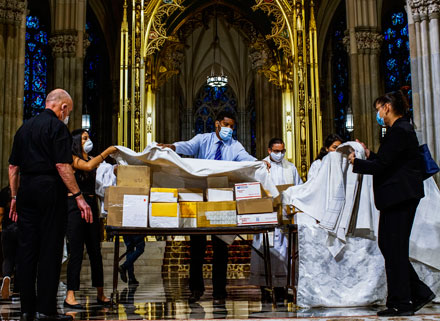 Cayeron en el cumplimiento de su deber, señaló Jorge Islas López, cónsul de México en Nueva York, durante la ceremonia luctuosa realizada en el aeropuerto de la Ciudad de México a los 245 connacionales fallecidos por la pandemia, cuyas cenizas llegaron en un avión de la Fuerza Aérea Mexicana. En la mañana se celebró una misa solemne en la neoyorquina catedral de San Patricio (imagen) para despedirlos. La cancillería informó que se repatriará a los más de mil 500 paisanos perecidos en otros países. Foto Ap / Carolina Gómez