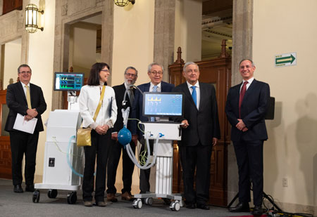 ▲ El presidente Andrés Manuel López Obrador encabezó la presentación de los ventiladores Ehécatl y Gätsi, los cuales fueron creados por el Centro de Desarrollo Industrial del Consejo Nacional de Ciencia y Tecnología. Lo acompañan, de izquierda a derecha: Marcelo Ebrard, María Elena Álvarez-Buylla, José Cruz Pineda Castillo, Jorge Alcocer y Hugo López-Gatell. Foto Presidencia