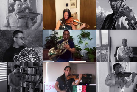 ▲ Los integrantes de la Orquesta Sinfónica Nacional grabaron desde su casa la pieza de José Pablo Moncayo, en un video que les llevó cuatro semanas de arduo trabajo, con resultado de una obra que en tres días rebasó 250 mil reproducciones en su página de Facebook, como parte de un proyecto que denominaron Tempo en casa, explicó Carlos Miguel Prieto, su director titular, quien participó en la sección de violines segundos. Foto tomada de Facebook / Ángel Vargas