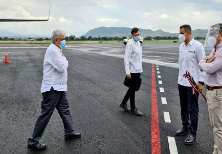 ▲ El Corredor Interoceánico del Istmo de Tehuantepec será uno de los proyectos insignia que deje este gobierno, pues será el motor y punta de lanza para el desarrollo de una región históricamente olvidada económica y socialmente, como es el sur-sureste del país, afirmó a La Jornada Rafael Marín Mollinedo, encargado del proyecto. Dijo que no tiene duda de que a finales del primer semestre de 2021 arrancará el primer tren que transportará contenedores entre los puertos de Veracruz y Oaxaca. En la imagen, arribo del Presidente a Oaxaca para una gira de tres días; lo recibió el gobernador Alejandro Murat (derecha). Foto tomada de Twitter Braulio Carbajal