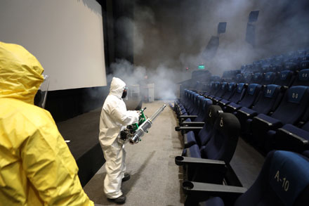 ▲ Empleados de la Cineteca Nacional realizan labores de desinfección en las salas para el reinicio de funciones. Las cadenas Cinemex y Cinépolis también comenzaron labores al 30 por ciento de capacidad y estrictos protocolos como el uso de cubrebocas, tomas de temperatura y aplicación de gel. La concurrencia ayer fue escasa. Foto José Antonio López. / Ana Mónica Rodríguez
