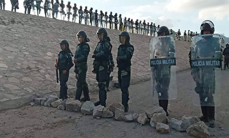 ▲ Integrantes de la GN resguardan la presa derivadora Las Pilas, en las inmediaciones de La Boquilla, ubicada en San Francisco de Conchos, Chihuahua, la cual cumplió dos días bajo control de unos 100 encapuchados. El presidente Andrés Manuel López Obrador señaló que en la ocupación participaron dos ex gobernadores priístas, entre ellos Fernando Baeza, y un diputado de Acción Nacional, quienes armaron a la gente, mientras el senador Gustavo Madero intervino desde la Ciudad de México. En tanto, 17 agentes federales se hallan sujetos a investigación por el ataque a dos agricultores. Foto Jorge Torre. A. Muñoz, F. Martínez. G. Castillo y Corresponsales
