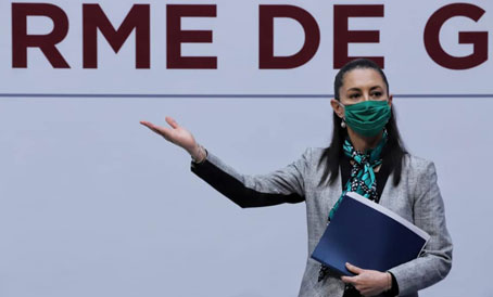 ▲ Claudia Sheinbaum, jefa de Gobierno de la Ciudad de México, ofreció, de manera virtual desde el patio del Antiguo Palacio del Ayuntamiento, su segundo Informe ante el Congreso capitalino. Escuchó mediante una pantalla las posturas de los grupos parlamentarios. Sólo hizo alusión a lo expuesto por el panista Diego Garrido, quien habló de una capital insegura. Le respondió: Ojalá pueda revisar con detalle las cifras, porque probablemente se quedó con las de 2018. Foto Gobierno de la CDMX