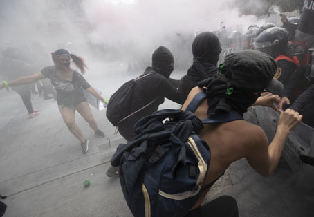 ▲ Ayer hubo movilizaciones en la Ciudad de México por el Día de Acción Global por un Aborto Legal, Seguro y Gratuito. Las autoridades decidieron contener a colectivos feministas, así como a otros grupos, para evitar su arribo al Zócalo, donde acampa el Frente Anti-AMLO. Los choques ocurrieron en avenida Juárez, a la altura de Balderas, y en el Eje Central. El saldo oficial es de 43 mujeres policías y 13 manifestantes lesionadas. En 10 estados hubo marchas. Foto Alfredo Domínguez. J. Xantomila, L. Gómez y Corresponsales
