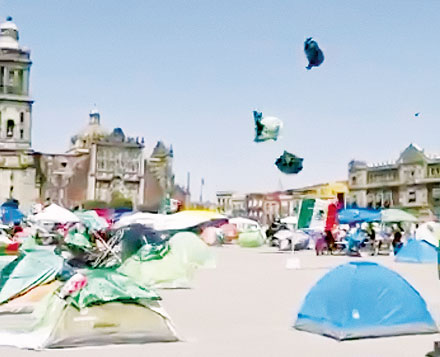 ▲ Un ventarrón provocó ayer por la mañana que algunas de las carpas de integrantes del Frente Nacional Anti-AMLO, que se mantienen en plantón en el Zócalo capitalino, volaran en círculos por varios metros. El hecho fue transmitido en redes sociales por un usuario que captó el momento preciso. Transeúntes se mofaron: Ridículos, si tuvieran gente eso no pasaría. / Rocío González