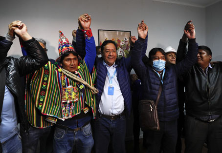 ▲ Luis Arce, candidato presidencial del Movimiento al Socialismo, celebra su victoria junto con partidarios durante conferencia de prensa en La Paz. El ex ministro de Economía en el gobierno de Evo Morales, al conocer a la medianoche los resultados a boca de urna, expresó: