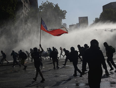 ▲ La policía lanzó durante horas chorros de agua a opositores al gobierno que protestaban en la Plaza de la Dignidad, en la ciudad de Santiago, a dos días de la consulta en la que 15 millones de ciudadanos están convocados a votar
