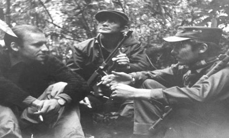 ▲ En la imagen aparece César Macías (centro), mejor conocido como César Montes, dirigente histórico de las Fuerzas Armadas Revolucionarias de Guatemala, durante una entrevista con el escritor uruguayo Eduardo Galeano (izquierda) en 1968; los acompaña el rebelde Rocael. El pasado 9 de octubre, en un operativo de Migración y la Guardia Nacional en Acapulco, Montes fue detenido y trasladado a la frontera chiapaneca para ser entregado, sin proceso de extradición, a autoridades de su país, denunciaron varias organizaciones. Desde prisión, el ex combatiente de 77 años escribió que estaba en proceso su pedido de refugio. Foto Siglo XXI Editores. Blanche Petrich
