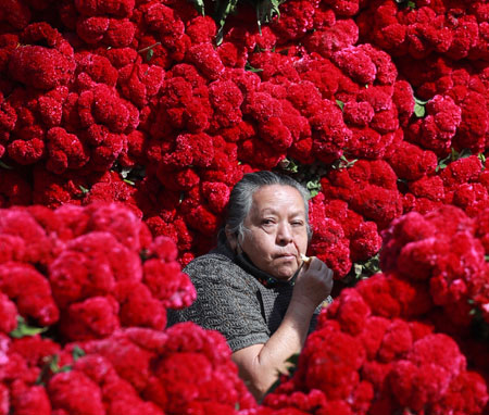 ▲ La producción de la flor tradicional en la celebración del Día de Muertos disminuyó alrededor de 40 por ciento debido a la pandemia. En ese tenor, la Concanaco-Servytur estimó que los negocios relacionados con este festejo sólo obtendrán 50 por ciento de los ingresos del año pasado, aunado al cierre de panteones. En la imagen, comerciante en el mercado de Jamaica. Foto Luis Castillo