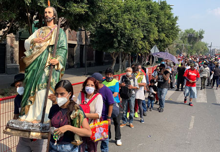 ▲ Alrededor de 4 mil 300 personas acudieron ayer a la iglesia de San Hipólito, ubicada en avenida Hidalgo y Paseo de la Reforma, pese a los llamados del gobierno capitalino de seguir la celebración a San Judas Tadeo, señor de las causas perdidas, por Internet para prevenir contagios por coronavirus. Los feligreses ingresaron al recinto entre las 10 y 16 horas, pero finalmente se determinó cerrarlo por la multitud y porque no se respetaba la sana distancia. Foto José Antonio López. / Alejandro Cruz, Roció González y Laura Gómez