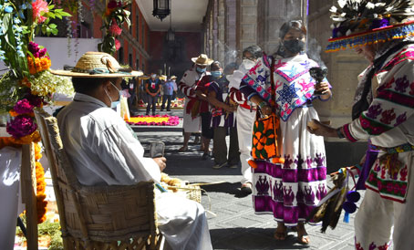 ▲ Por primera vez, las puertas del recinto se abrieron a representantes de varios pueblos originarios, quienes encabezaron en el patio central una ceremonia tradicional wixárica y rezos tzeltales dedicados a los fieles difuntos. Así concluyeron ayer las actividades de la ofrendahomenaje Una flor para cada alma: 20 pueblos, 4 rumbos, en el contexto de los tres días de luto nacional decretado por el presidente Andrés Manuel López Obrador para recordar a los fallecidos por la pandemia. Foto Presidencia. Mónica Mateos-Vega
