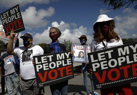 ▲ Ante las amenazas de violencia electoral promovidas por el presidente Donald Trump, varias organizaciones se han movilizado (en la imagen en Florida) para exigir que se respeten resultados, al tiempo de promover el voto masivo. A unas horas de los comicios, las encuestas indicaban que el candidato demócrata Joe Biden mantenía una ventaja de ocho puntos sobre su adversario republicano. Foto Ap