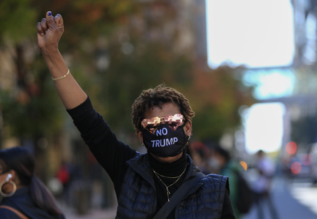 ▲ Unos 150 simpatizantes de Joe Biden y de su adversario Donald Trump se lanzaron consignas frente al Centro de Convenciones de esa ciudad, en Pensilvania. ¡Cuenten todos los votos!, gritaron quienes apoyan al demócrata. En una esquina opuesta, los partidarios al magnate exigieron detener la revisión de los sufragios recibidos después del 3 de noviembre. Por la pandemia, ese estado autorizó el conteo de las boletas enviadas por correo en la jornada electoral y recibidas hasta tres días después. Foto Afp