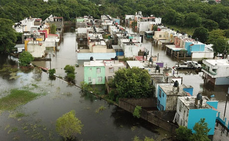 ▲ La madrugada de este sábado coincidieron intensas lluvias en la planicie tabasqueña y en la zona de la presa Peñitas, por lo que se tuvo que incrementar su desfogue a 2 mil 100 metros cúbicos por segundo, lo que implicó riesgo de una inundación mayor en Villahermosa (imagen). Ante tal situación, el presidente Andrés Manuel López Obrador suspendió su gira por Nayarit y por primera vez voló en un avión de la Fuerza Aérea para atender la situación en su estado natal. Foto Cuartoscuro