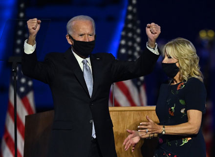 ▲ El candidato demócrata emitió su primer discurso como presidente electo acompañado por su esposa, Jill Biden, y su compañera de fórmula, Kamala Harris, quien hará historia como la primera mujer vicepresidenta, de color y migrante.