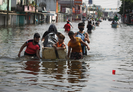 ▲ Habitantes de la zona sur de la colonia Gaviotas de la capital tabasqueña abandonan sus hogares tras subir el nivel de las aguas por las filtraciones del cauce del río. El gobernador Adán Augusto López Hernández informó que en algunos lugares el líquido alcanzó tres metros de altura. Descartó la evacuación del centro de esa capital, porque se reforzaron protecciones. Expuso que las inundaciones en el estado han causado hasta el momento 135 mil damnificados. Foto Cuartoscuro. René Alberto López, Corresponsal