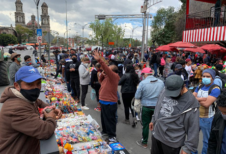 ▲ Cuando la capital del país se encuentra en alto riesgo por contagios de Covid-19 y con aumento de hospitalizaciones, miles de ciudadanos volvieron a desbordar ayer las calles del Centro Histórico sin aplicar las medidas de higiene y sana distancia para no enfermarse. En tanto, plazas y tiendas empezaron a colocar el código QR para detectar casos en espacios cerrados, y cientos de personas hacían largas filas en los macrokioscos para realizarse la prueba rápida. Foto José Antonio López / Á. Bolaños y E. Bravo
