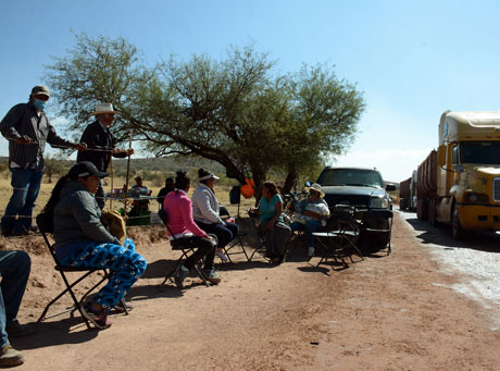 ▲ Habitantes de San Juan de las Carboneras llevan tres meses con bloqueos al acceso a la mina de oro a cielo abierto, filial de la concesión Real de los Ángeles, operada por Grupo Frisco. Denunciaron que la Secretaría General de Gobierno y la Fiscalía General de Justicia de Zacatecas obstaculizaron en dos ocasiones la firma de un convenio para la reparación de daños de 130 viviendas por las detonaciones de dinamita realizadas en el yacimiento. Foto Alfredo Valadez. / Alfredo Valadez Rodríguez, corresponsal