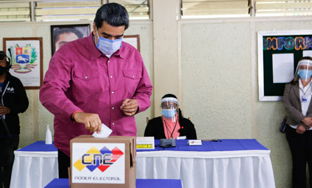 ▲ El presidente Nicolás Maduro emite su voto en un centro electoral de Caracas. El mandatario celebró el desarrollo pacífico de los comicios legislativos, al tiempo que afirmó que