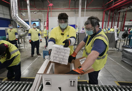 ▲ Cajas con la vacuna de Pfizer/BioNTech son preparadas para su envío en la planta de la primera en Kalamazoo, Michigan. Un ejército de camiones cargados con millones de dosis partieron ayer rumbo a centros estratégicos de empresas de paquetería, las cuales se encargarán de distribuirlas. La farmacéutica estima que 20 aviones transportarán diariamente los biológicos hacia poblaciones de todo Estados Unidos. Es como el