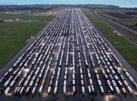 ▲ En una pista del aeropuerto de Manston, cerca de Dover, fueron estacionados infinidad de camiones de carga que no pudieron pasar a Francia y otros países europeos debido al cierre de fronteras ante la propagación de la nueva cepa del coronavirus en Gran Bretaña. Esta situación agudizó los obstáculos en las negociaciones finales del Brexit, a 10 días de que Londres abandone oficialmente la UE. La Comisión Europea recomendó que se facilite la reanudación del tráfico con Reino Unido para evitar el desabasto. Foto Afp. / Agencias