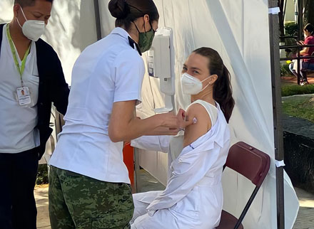 ▲ La doctora Julia Hernández Carlsen, residente de medicina interna del Hospital General de Zona número 30 del IMSS, en la alcaldía Iztacalco, es vacunada contra el Covid-19. La profesional de la salud fue una de las primeras tres personas en México que, junto con la enfermera María Irene Ramírez, de 59 años, y el doctor Fernando Molinar, de 70, recibieron el biológico de Pfizer-BioNTech, durante la jornada de inoculación iniciada este jueves 24. Foto La Jornada