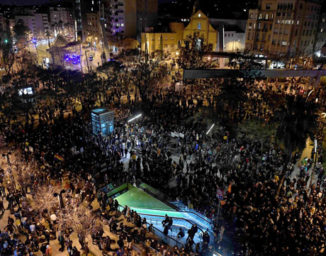 ▲ Centenares de jóvenes protestaron en varias ciudades catalanas (Barcelona, en la imagen) tras la captura de Pablo Hasél por la policía autonómica, la cual tuvo que superar varias barreras de estudiantes que protegían al cantante. En sus letras llama