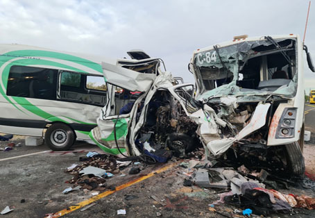 ▲ La colisión entre un autobús de la compañía Movimex, que llevaba empleados de la mina Noche Buena, propiedad de Penmont, y una camioneta de la firma Transportes Ejecutivos Premier, ocurrió alrededor de la 3:30 de la madrugada. Los 16 ocupantes del vehículo del negocio turístico fallecieron; en su mayoría son originarios del estado de México, Hidalgo y Veracruz. Foto cortesía Caborca Informa