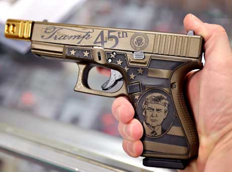 ▲ El presidente de Estados Unidos emitió media docena de órdenes ejecutivas para el control de armas de fuego ante la proliferación de ataques, a los que calificó de vergüenza para su país. El anuncio se dio en una jornada en la que murieron seis personas, entre ellas dos niños, y cinco resultaron heridas en dos tiroteos en Rock Hill, Carolina del Norte, y Bryan, Texas. En la imagen, un empleado de una armería de Illinois ofrece una pistola Glock 19 conmemorativa con la imagen del ex mandatario Donald Trump. Foto Afp. / Agencias