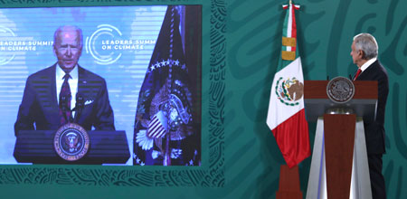 El presidente Andrés Manuel López Obrador pidió a su par estadunidense financiar el programa en Centroamérica, el cual ayudará a captar 70 millones de toneladas de dióxido de carbono y generará empleos. Dijo que México reduce el uso de combustóleo o carbón para producir electricidad y evita el uso excesivo de combustibles fósiles, mientras Biden anunció el compromiso de disminuir 52 por ciento las emisiones con efecto invernadero para 2030. Foto Yazmín Ortega Cortés / F. Martínez, R. Garduño, D. Brooks y Agencias