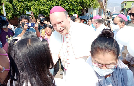 ▲ El nuncio apostólico en México, Franco Coppola, ofi ció una misa ante más de 2 mil personas en este poblado michoacano, del que decenas de familias han huido por la constante violencia desatada por los cárteles de la droga. Dijo que acudió para que el mundo conozca la crisis humanitaria y el abandono que padecen sus habitantes. Antes de la celebración religiosa, se reunió en privado con víctimas de la inseguridad en la región, quienes le hablaron de las balaceras, enfrentamientos, desabasto de productos básicos y cierre de caminos, que los ha tenido incomunicados. El jerarca católico llegó el jueves a Apatzingán y ayer se trasladó por tierra a Aguililla; pasó por El Aguaje, comunidad donde sólo quedan 300 de sus 2 mil habitantes, con quienes también habló. Foto Ernesto Martínez / E. Martínez Elorriaga