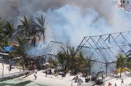 ▲ Un incendio, presuntamente originado la mañana de ayer en la cocina del restaurante Mocambo, ubicado sobre la avenida Rueda Medina, la más importante de Isla Mujeres, Quintana Roo, ocasionó que se perdieran de manera total ese negocio y siete más, informó Protección Civil de la ínsula. Si bien el viento que se registró ayer en el área atizó el fuego, una vez sofocado, tardó en disipar el olor a humo que impregnó a toda la localidad. Foto La Jornada. Patricia Vázquez, Corresponsal, y La Jornada Maya