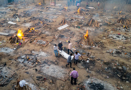 ▲ Por quinta jornada al hilo, la nación reportó una máxima cifra mundial de contagios y un récord nacional de 2 mil 812 fallecidos a causa del Covid-19. El gobierno habilitará lo más pronto posible la infraestructura médica militar para atender a civiles, mientras el presidente de Estados Unidos, Joe Biden, prometió apoyo incondicional para fabricar vacunas. En la imagen, familiares cargan el cuerpo de una persona que murió por el Covid-19 en medio de piras ardientes de otras víctimas en un crematorio en Nueva Delhi. Foto Afp