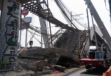 ▲ La Fiscalía General de Justicia capitalina encabezó ayer las labores de limpieza, inspección, desmontaje, retiro y resguardo de indicios, entre ellos las cajas negras, sobre las posibles causas del desplome del viaducto elevado y dos vagones en la intersección de las estaciones Olivos y Tezonco. También acudieron un notario público y agentes especializados de investigación. Foto Pablo Ramos