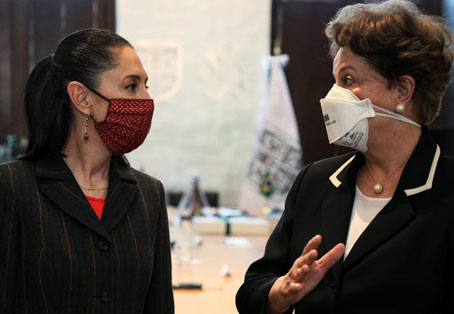 ▲ Claudia Sheinbaum, jefa de Gobierno capitalina, recibió a la ex presidenta de Brasil en el antiguo Palacio del Ayuntamiento. La visitante elogió que México lo encabecen personajes comprometidos con algo crucial en el continente: combatir nuestras milenarias desigualdades. La mandataria local expuso: a nosotros, como a usted, Dilma, no nos vence ni la mentira ni la calumnia. Por otra parte, el presidente Andrés Manuel López Obrador manifestó que Sheinbaum es ‘‘una persona incorruptible y comprometida a que se aplique la justicia en el caso de la tragedia en la línea 12 del Metro’’. Foto Gobierno de la CDMX. R. González, F. Martínez y R. Garduño