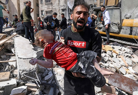 ▲ Un palestino rescata a una niña de los escombros de uno los tres edificios destruidos ayer en Gaza por la aviación israelí. En la cruenta ofensiva también fueron dañadas varias instalaciones de salud, entre ellas una clínica que proveía cuidados para traumas y quemaduras, cuya sala de esterilización quedó inservible, así como un hospital de Médicos sin Fronteras. Foto Afp