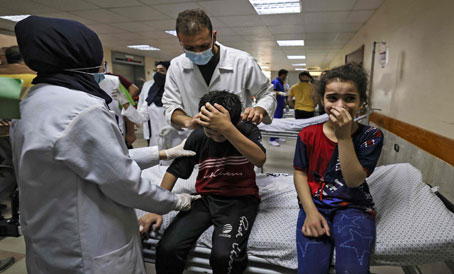 ▲ Desconsuelo de la familia palestina Abu Dayer en el hospital Al-Shifa, en Gaza, tras conocer el deceso de varios de sus integrantes por los bombardeos de la aviación israelí. Ayer, la Media Luna Roja catarí informó que sus oficinas resultaron dañadas, mientras el Ministerio de Salud indicó que varios de sus locales fueron alcanzados por los misiles. Foto Afp