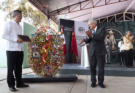 ▲ Con la presencia del embajador de la República Popular China, Zhu Qingqiao, el presidente Andrés Manuel López Obrador encabezó el acto en Torreón, Coahuila, donde el 15 de mayo de 1911, en plena Revolución, 303 migrantes cantoneses fueron asesinados por orden del general Benjamín Argumedo. El hecho es descrito como uno de los pasajes más oscuros de la historia de México y que devino en violencia explícita contra la comunidad cantonesa por más de dos décadas. Foto Presidencia. Enrique Méndez, Enviado