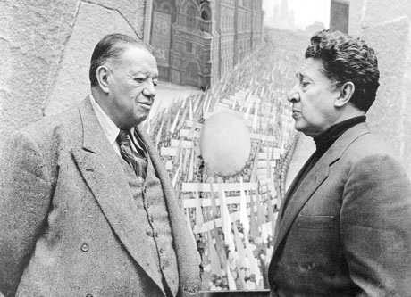 que en la fotografía se ve de forma muy clara. El volumen cuenta con imágenes de personalidades de la cultura, como Gabriel García Márquez, el poeta León Felipe y el ilustrador Eduardo del Río, Rius, entre otros. También figuran los pintores Diego Rivera y David Alfaro Siqueiros (imagen), quienes posan en la Galería Emma Hurtado, de la CDMX, en 1957. Foto tomada del libro / Reyes Martínez