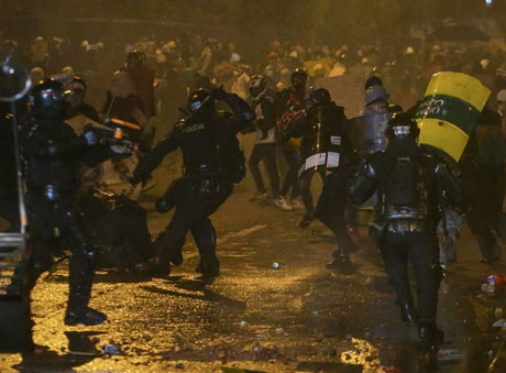 ▲ Un policía murió y ocho personas resultaron heridas (dos agentes y seis civiles) en una serie de enfrentamientos en Cali durante las protestas en repudio al presidente, iniciadas el 28 de abril en rechazo a la reforma fiscal, la cual fue retirada, pese a lo cual mantienen siete exigencias en materia social, educativa y de salud. La ONG Temblores reporta 43 muertos por la represión y casi 2 mil lesionados, así como 23 denuncias por violencia sexual contra manifestantes. La imagen, en la capital Bogotá. Foto Ap / Europa Press y Prensa Latina