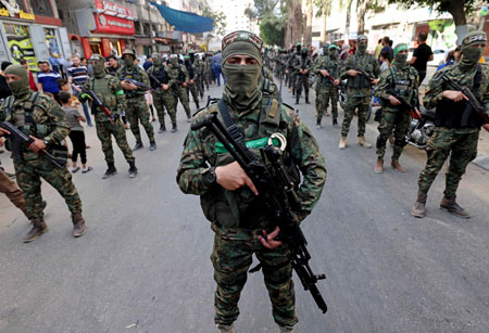 ▲ En lo que fue su primera declaración unánime tras 11 días de bombardeos, con saldo de más de 260 muertos, el Consejo de Seguridad reconoció el papel fundamental de Egipto y otros países de la zona para lograr la pacificación. Estados Unidos consiguió que se eliminara un párrafo del documento, el cual condenaba la violencia contra civiles y los actos de terrorismo. Mientras, cientos de combatientes de Hamas desfilaron ayer por Gaza, en lo que fue la primera aparición pública de su líder, Yahya Sinwar. Foto Afp / Agencias