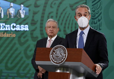 ▲ Carlos Slim Domit, presidente del consejo de administración de Grupo Telmex y representante de la Fundación Slim, participó en la conferencia matutina en Palacio Nacional, donde se anunció la inminente liberación de los primeros lotes de la vacuna de AstraZeneca, la cual fue producida en Argentina y envasada en México. La fundación inició el año pasado pláticas con la farmacéutica y la Universidad de Oxford para producir el antígeno contra el coronavirus en Latinoamérica sin fines de lucro. Foto Roberto García Ortiz